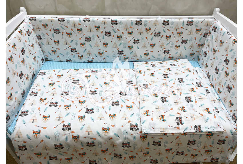Бортики СО СЪЕМНЫМИ ЧЕХЛАМИ в кроватку: защитят Вашего малыша от ушибов, сквозняков, солнечных лучей и не дадут малышу запутаться в прутьях кроватки. - Простыня на резинке 60х120 см (подходит для стандартной кроватки)